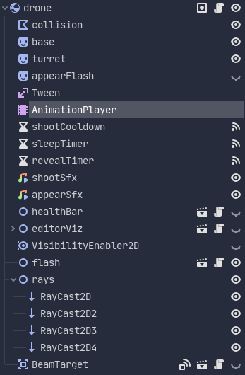 Shooting is the only other major thing it does. The shootCooldown node is a Timer. It calls shoot() whenever it times out. And the shoot() function randomizes the timer and restarts it. That makes the drone keep firing regularly (with a little random variation) until off screen or the drone or player are dead. If everyone is still alive and awake and on screen then the drone actually fires a bullet via the AnimationPlayer.