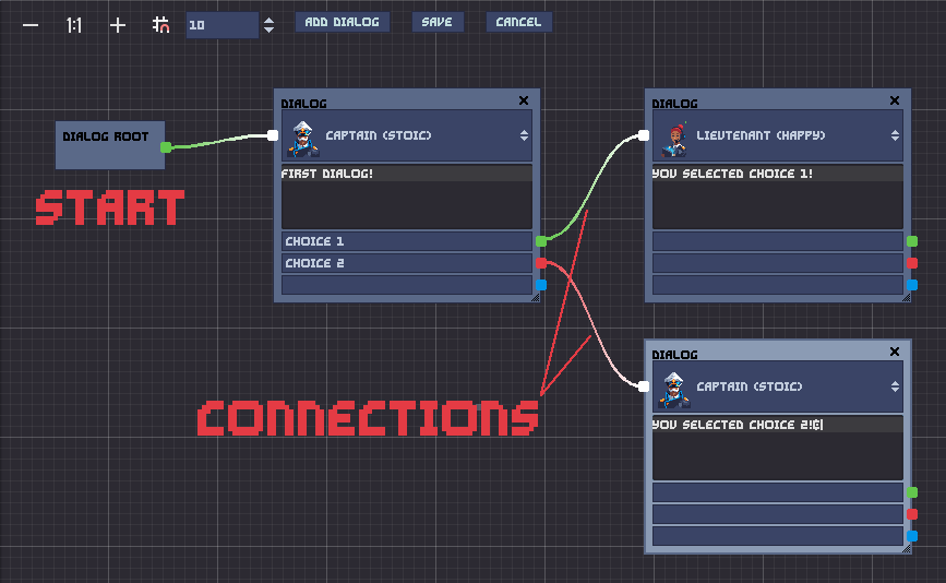 In the dialog editor, click Add Dialog to add another node. Each node has an actor, the text to say, and optional choices. If the choices are empty then only the green connection is used to advance to the next dialog node. Multiple choices are presented to the player so they can choose a branch.